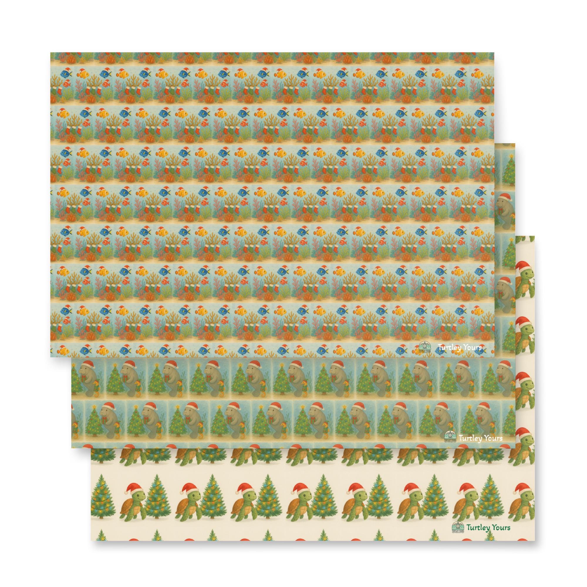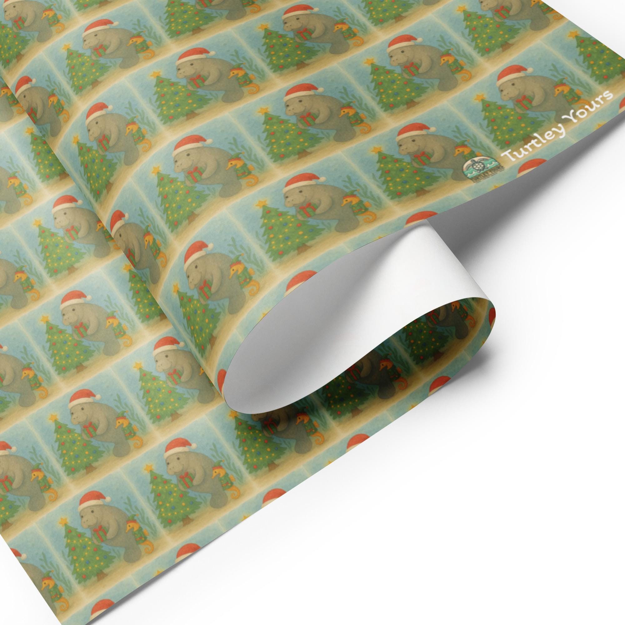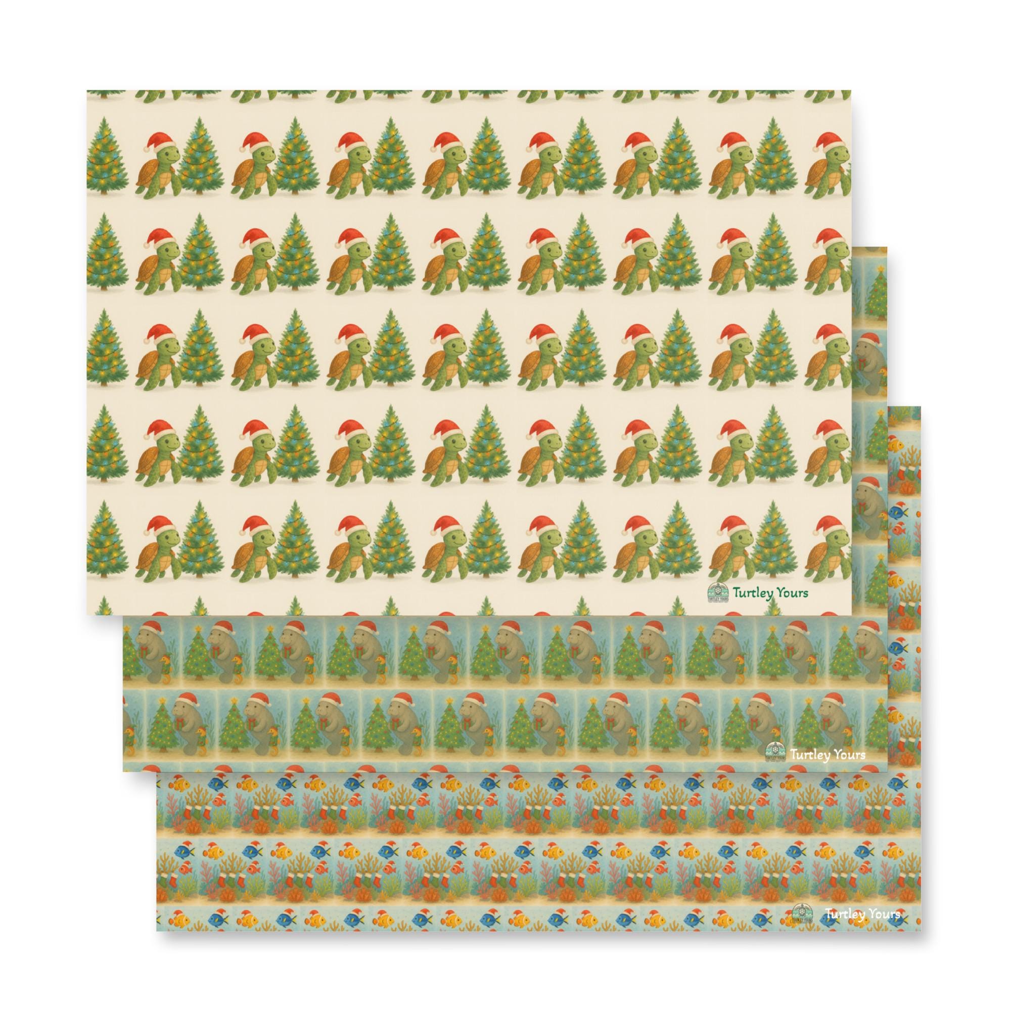 Wrap your gifts in coastal magic with this adorable holiday wrapping paper featuring three beloved ocean icons—sea turtles, manatees, and coral reefs—all dressed in festive cheer. Perfect for beach lovers, eco-conscious gifters, and anyone who believes presents should make a difference, this paper turns every gift into a tide of joy.