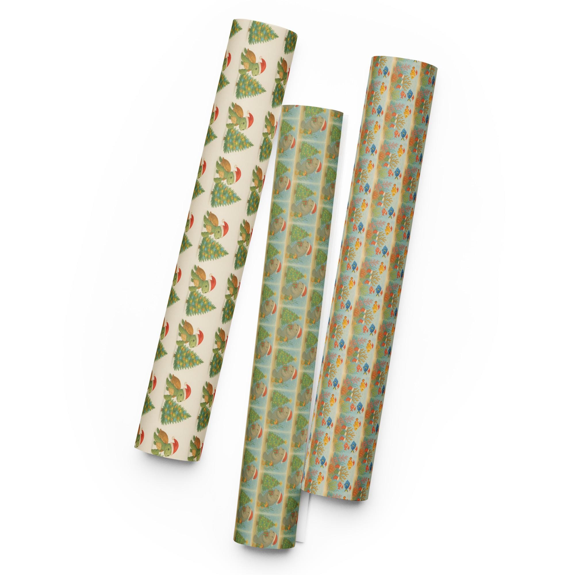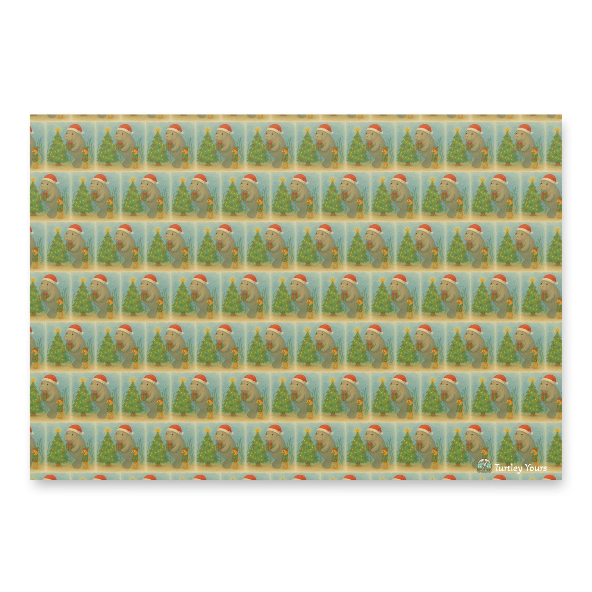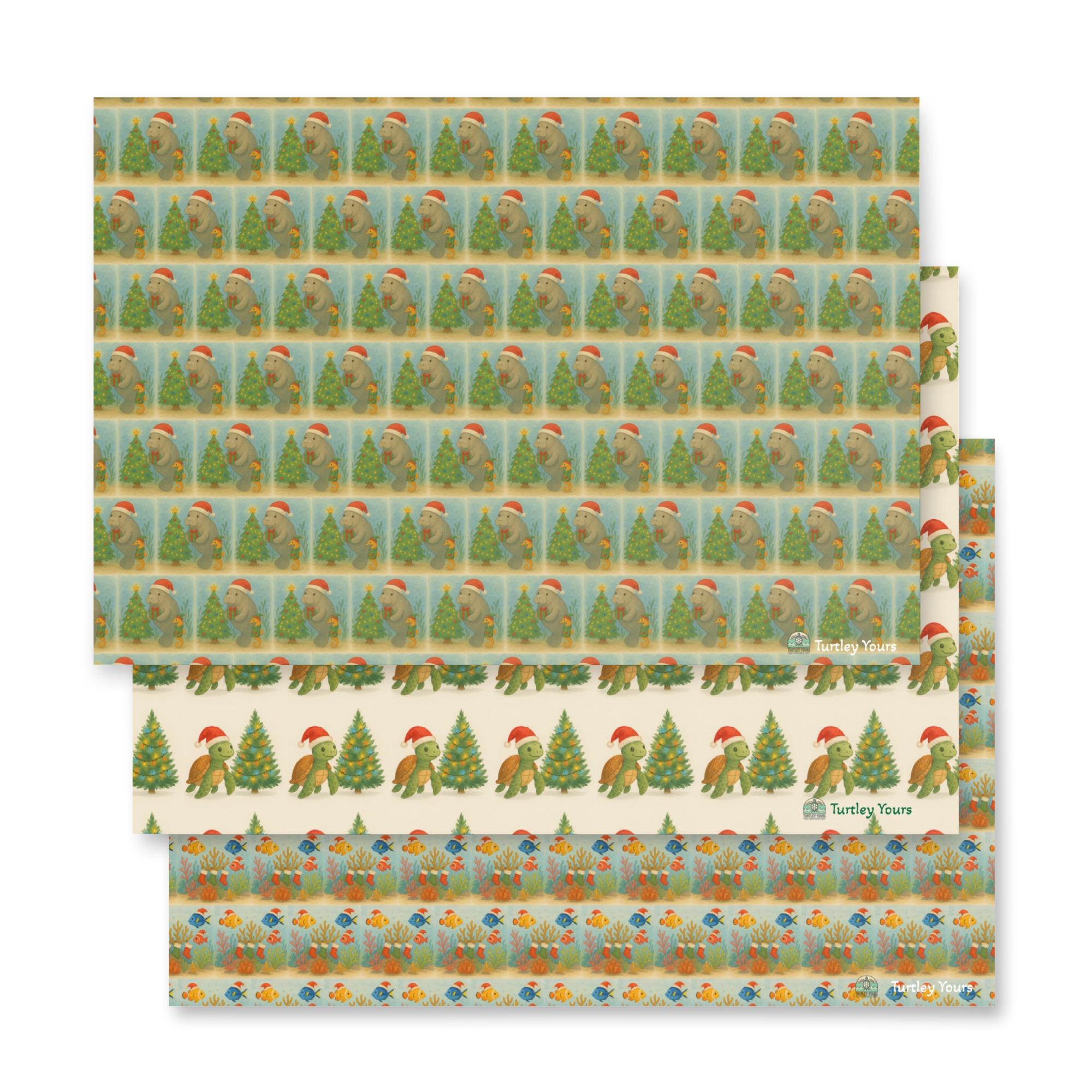 Wrap your gifts in coastal magic with this adorable holiday wrapping paper featuring three beloved ocean icons—sea turtles, manatees, and coral reefs—all dressed in festive cheer. Perfect for beach lovers, eco-conscious gifters, and anyone who believes presents should make a difference, this paper turns every gift into a tide of joy.