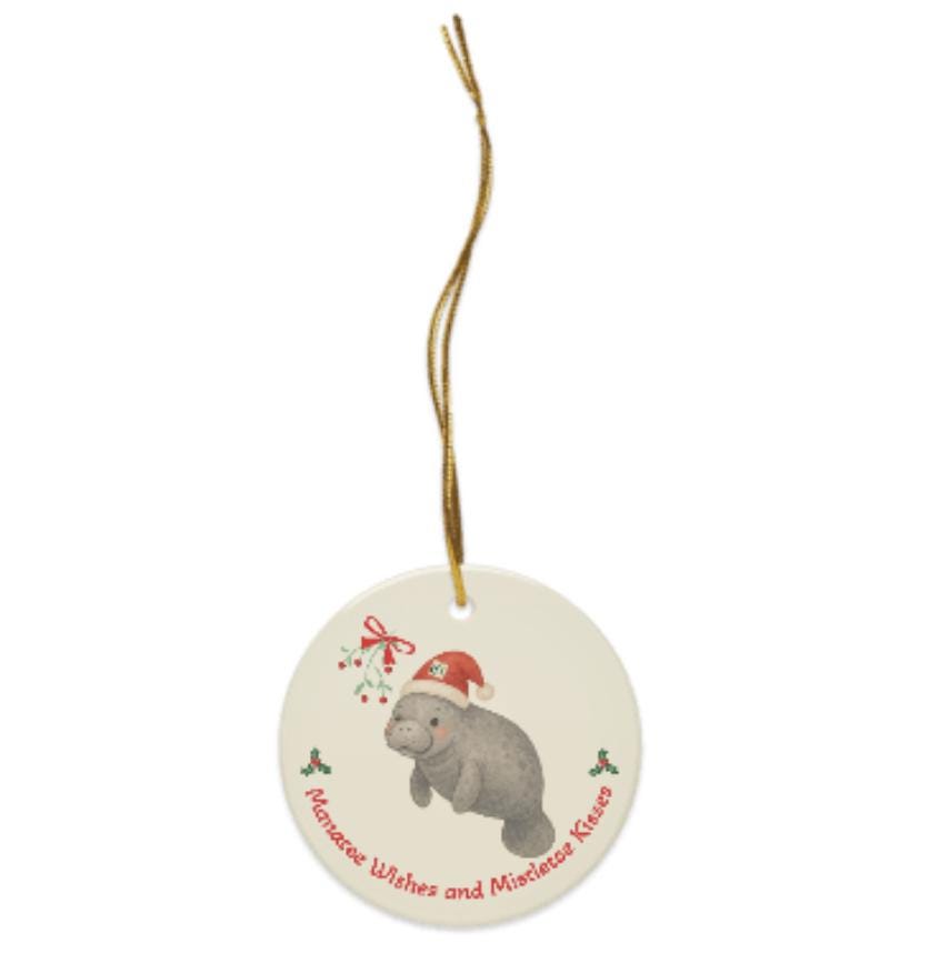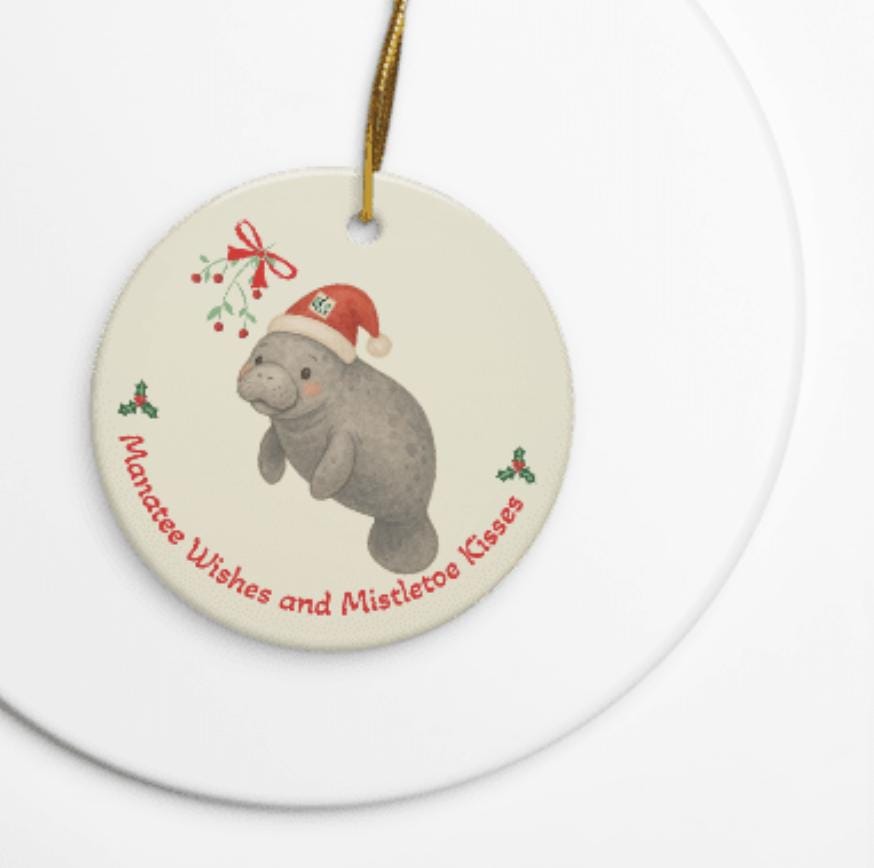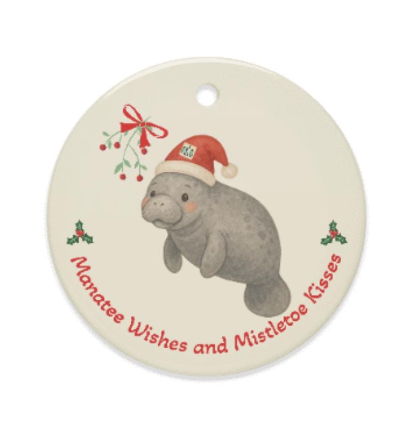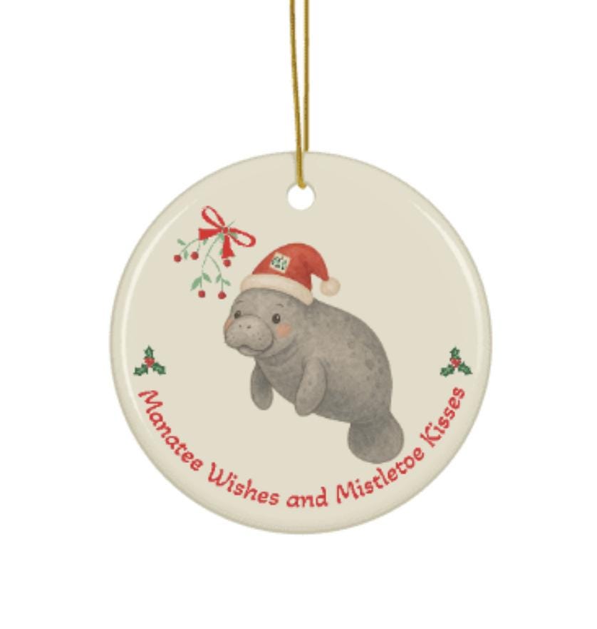 Add a splash of coastal magic to your holiday tree with this heartwarming manatee ornament. Featuring a gentle sea cow in a Santa hat and the message “Manatee Wishes & Mistletoe Kisses,” this piece is perfect for anyone who dreams of slow tides, warm waters, and a world where every creature is cherished. It’s more than décor—it’s a little hug from the sea.