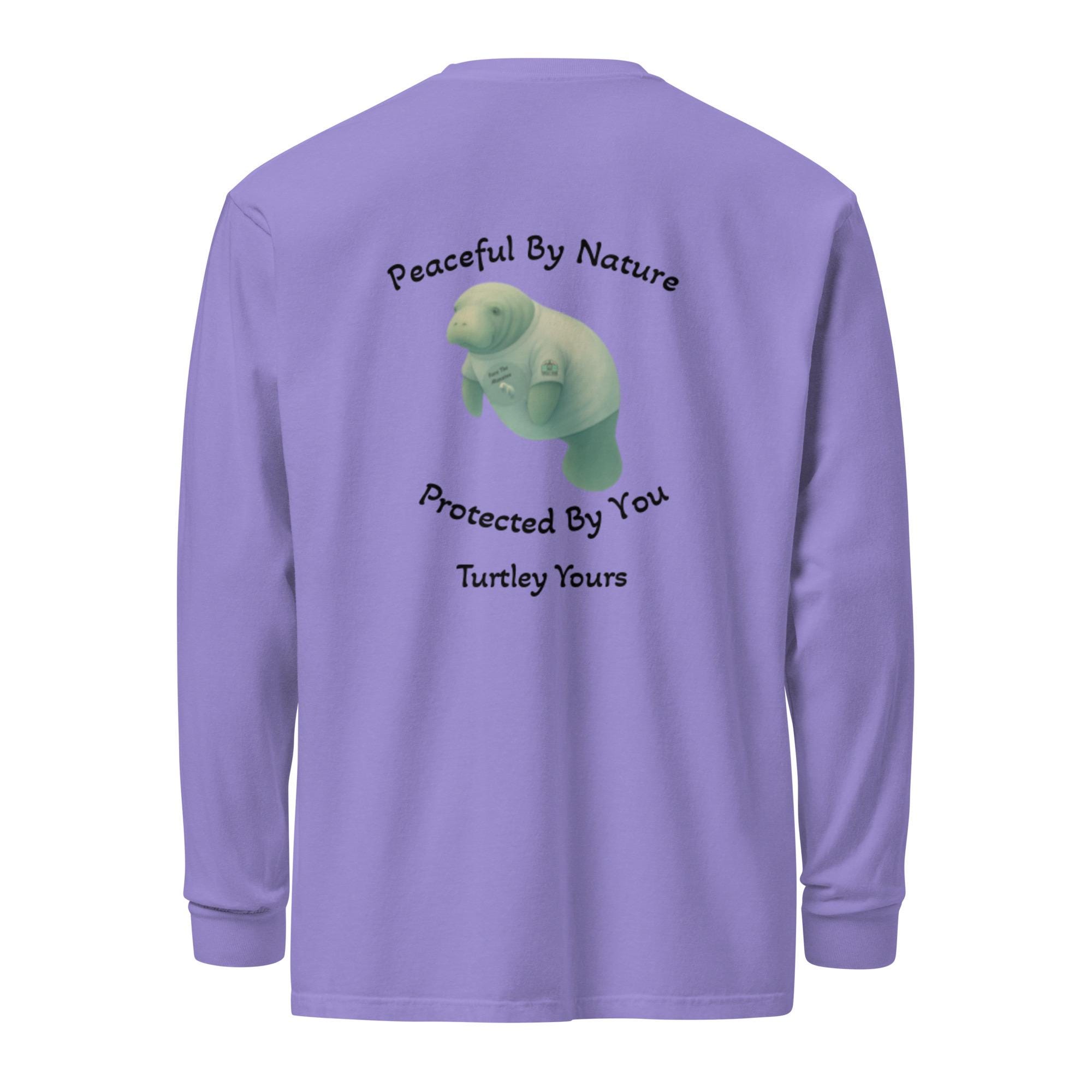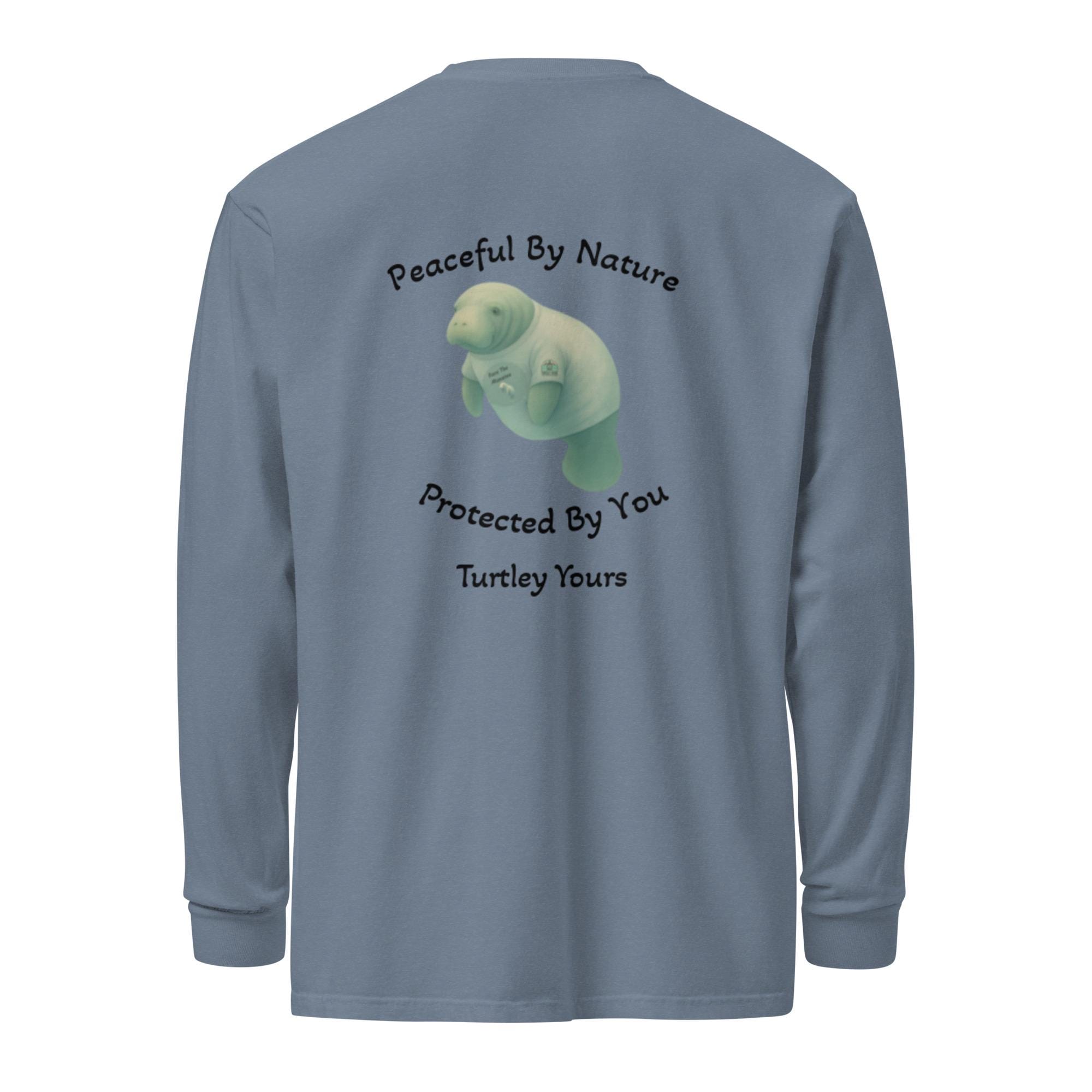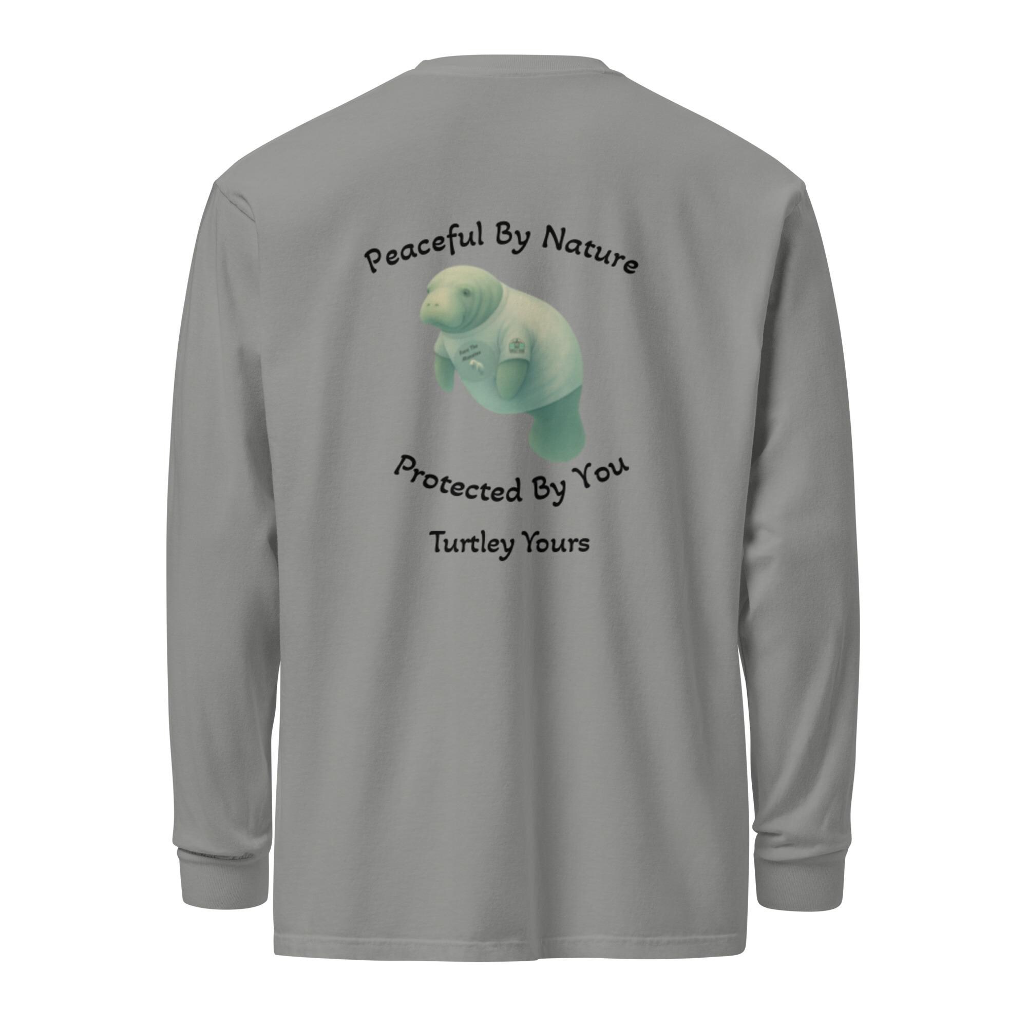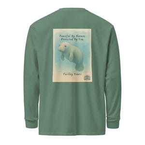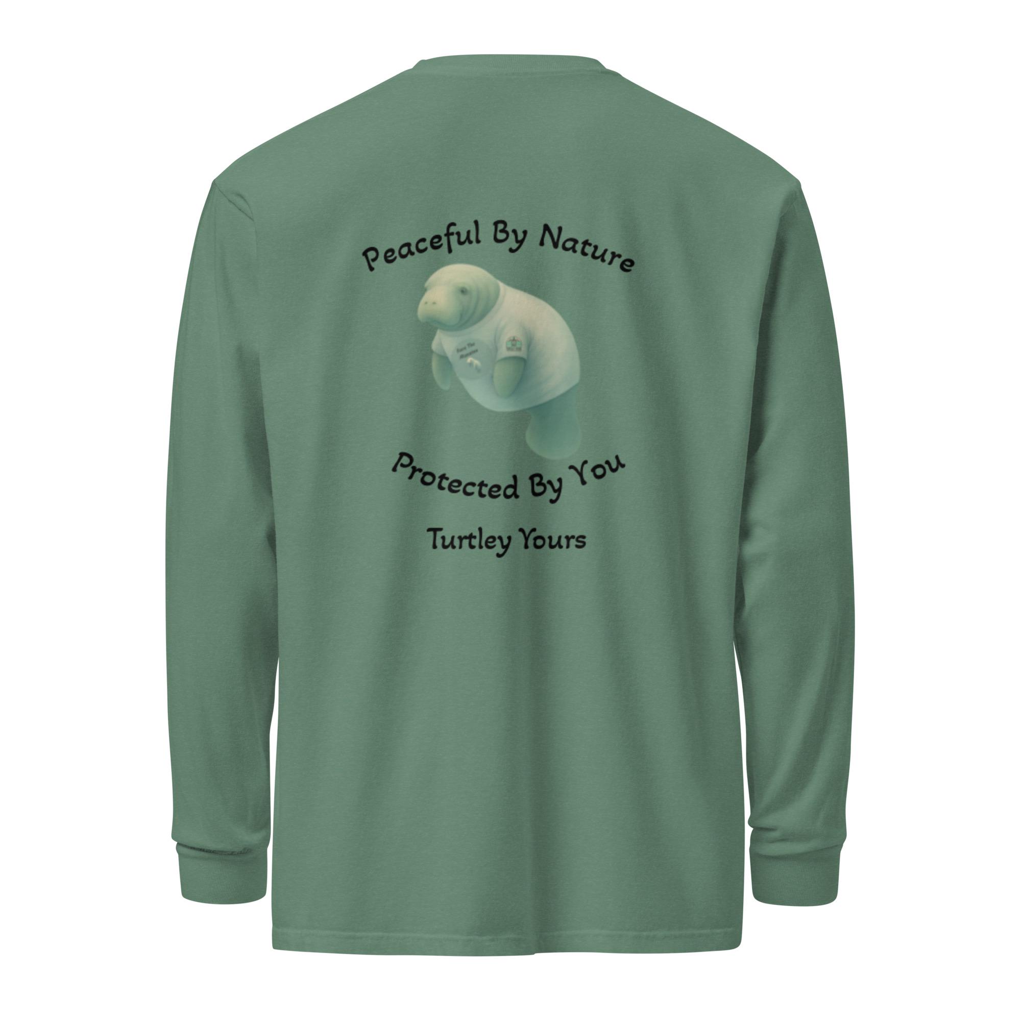 Ease into an ocean state of mind with our Manatee State of Mind long sleeve — designed for comfort, purpose, and peace. Featuring a soft watercolor-style manatee and the words “Peaceful by Nature, Protected by You,” this shirt reminds us that kindness and calm can create waves of change.