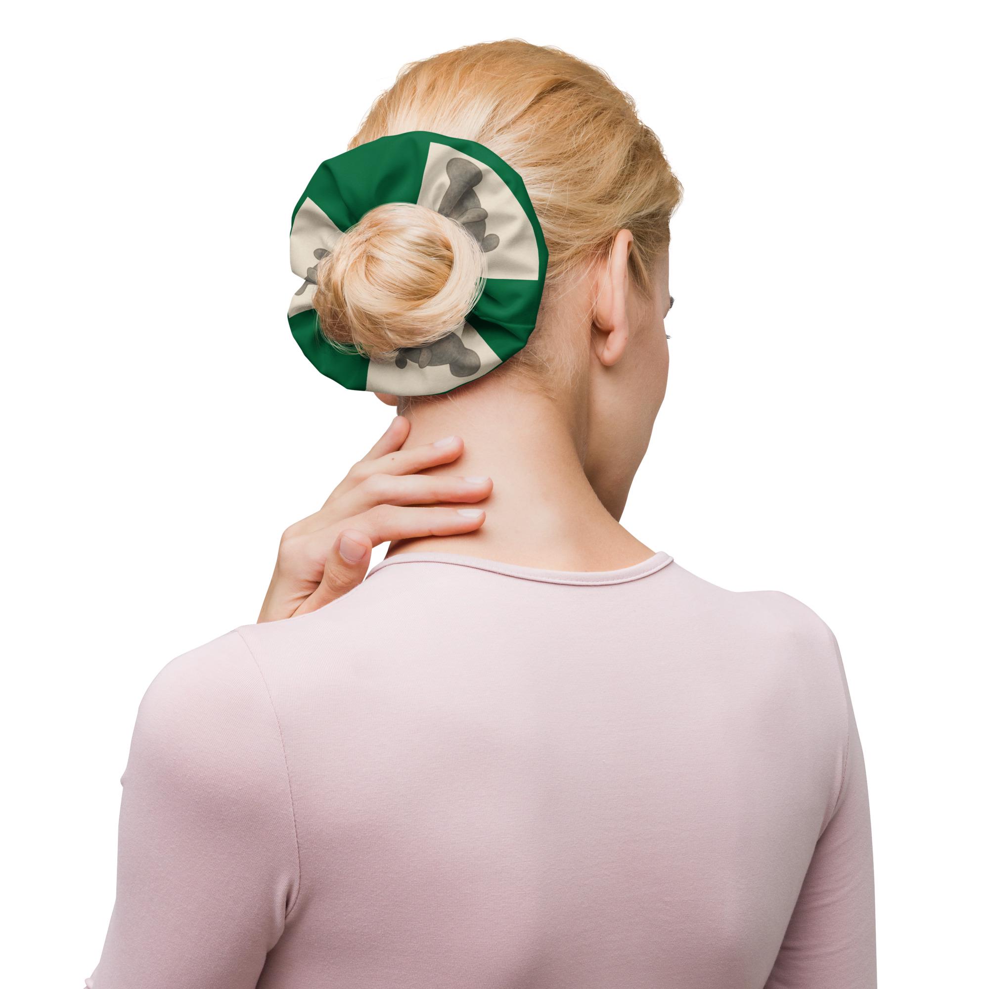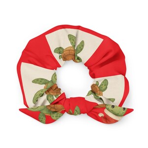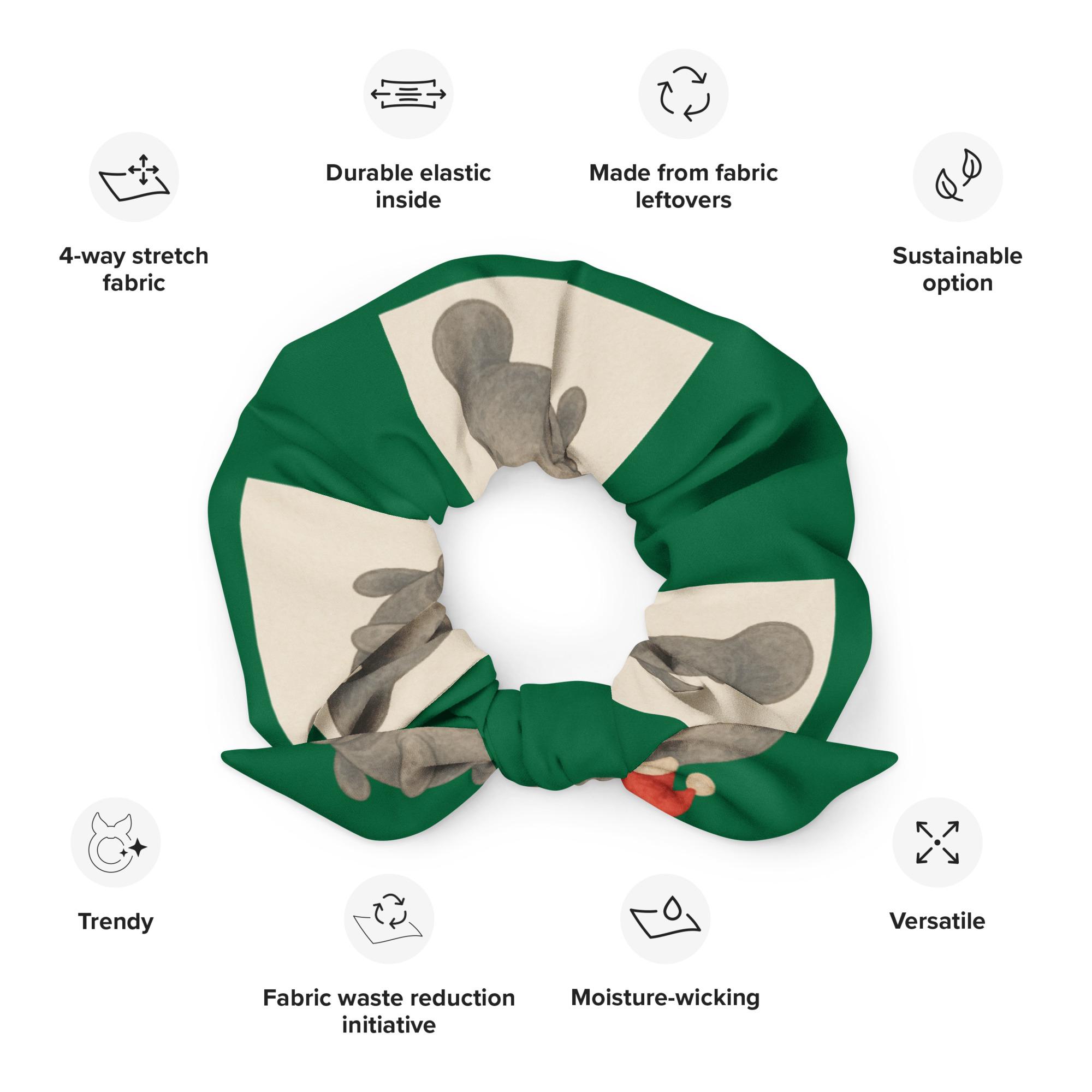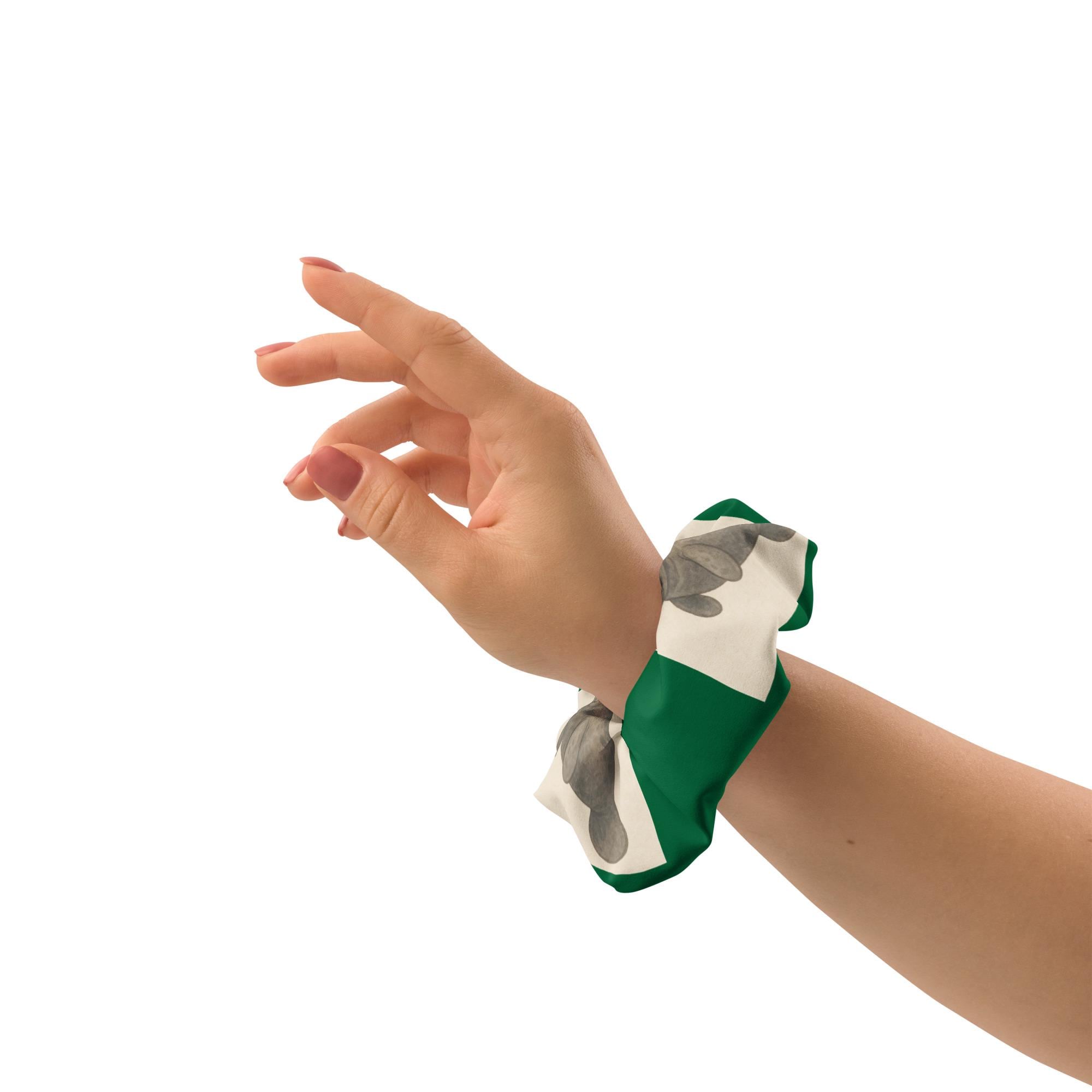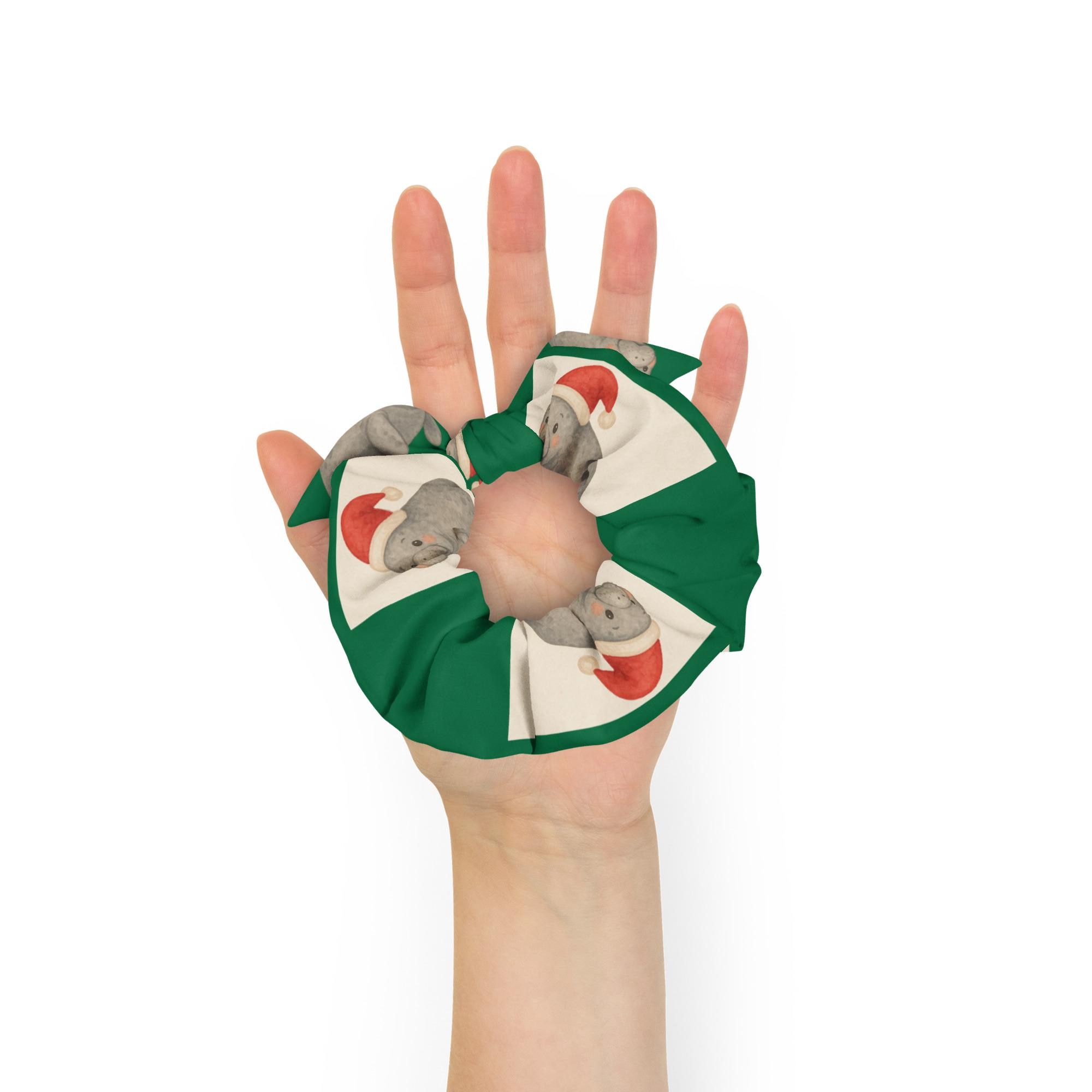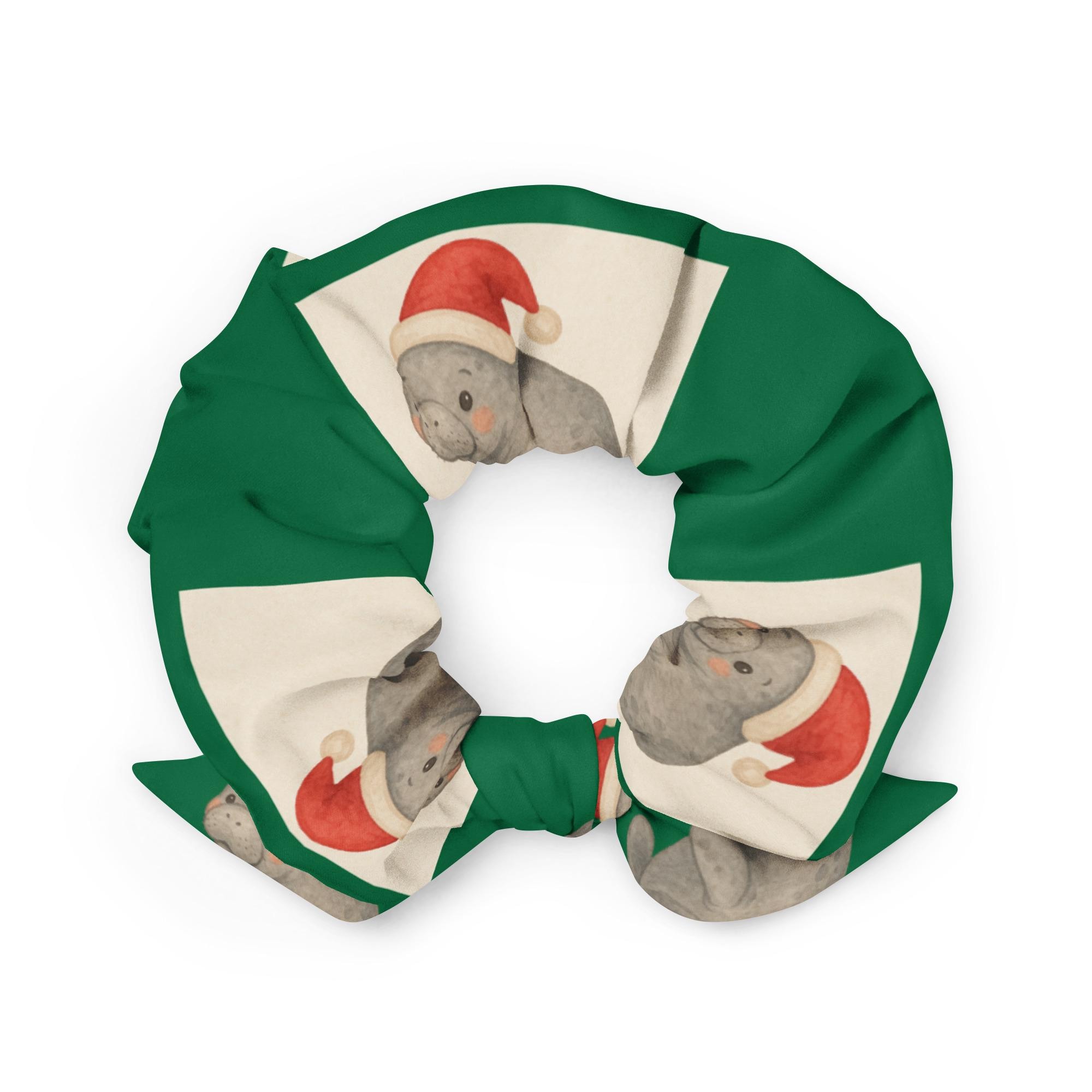 Add a splash of holiday joy and coastal kindness to your look with our Holiday Manatee Recycled Scrunchie! Featuring a cheerful manatee in Santa hats print wrapped in a festive green background, this eco-friendly accessory is made from recycled materials and designed to bring sustainable style to every season.